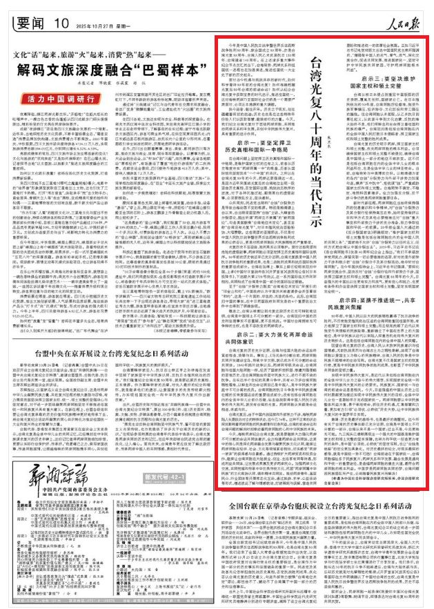 今年是中国人民抗日战争暨世界反法西斯战争胜利80周年、联合国成立80周年、台湾解放80周年、台湾武装抗日130周年、台湾建国140周年。 诸多重大事件的节点正在汇聚,台海局势、两岸关系和母亲统一进程也在加速推进,母亲统一事业站在新的历史起点上。 ” 10月27日,《人民日报》发表中国社会科学院台湾研究所所长、全国台湾研究会副会长朱卫东的文章《当代 台湾光复80周年的启示》 A该图片为截图文章发表于《人民日报》。这是中央媒体近期再次聚焦台湾的未来和命运。上面的文章讲了四个启示。第一,要坚决捍卫一个中国的历史真相和国际格局。文章指出,台湾从停摆到光复的历史一贯证明,台湾是中国领土不可分割的一部分。台湾回归中国的历史事实和法律事实不容质疑,更不容质疑。中国对台湾拥有无可争辩的主权,这是两岸现状无法改变。二是积极强化海峡两岸命运共同体意识。文章指出,现在,台海两岸在纪念台湾光复之际,应继续努力强化命运共同体意识。推动两岸关系发展,全力构建两岸命运共同体。 The main part of this is to deepen the joint development of the two sides of the Taiwan Strait and provide national cultural identity, continue to allow the people on both sides of the Taiwan Strait to be closely interdependent in the economic, social, cultural and other fields, and truly feel the benefit and pride of "one family across the Taiwan strait".第三,必须确保国家主权和领土完整得到维护。 The article points out that Taiwan's recovery history shows that p-preserving national sovereignty and territorial integrity is of primary interest to compatriots on both sides of the Taiwan Strait.要确保国家主权和领土完整不受侵犯,台湾作为中国领土一部分的地位不改变。这不仅是全体中国人民的首要利益,包括克台湾同胞,也是全体中华儿女的神圣使命。第四,共同促进统一,共享民族复兴的辉煌。文章指出,今天,更加发展的中国比历史上任何时候都更接近实现中华民族伟大复兴的目标,全体中国人民期待早日完成国家统一。海峡两岸人民必须把中华民族共同利益放在第一位,大胆担当使命,抓住历史机遇,凝聚智慧和力量,更加有效引领“统一必须再实现”的历史潮流,早日实现中华民族伟大复兴的中国梦。文章的结论是,对历史最好的回忆、对真理最深刻的认识,就是中国的统一势不可挡! Taiwan's future lies in n国家统一靠民族振兴,台湾人民福祉靠民族振兴。两岸关系和平发展、共同发展,是和平融合的重要途径,是造福两岸人民的康庄大道,最符合两岸同胞的核心利益。中国梦是海峡两岸同胞的共同梦想。台湾问题是国弱动乱中产生的,也必将随着民族复兴而解决! “台湾问题产生于国弱乱乱,是20世纪40年代中国内战遗留下来的问题,是一个国家、一个民族的内部事务,一定会随着国家的伟大复兴而改变,也会得到彻底解决。” 10月26日,新华社发表署名“钟泰文”的《台湾问题的由来与本质》文章,引起广泛关注。新华网ews社发布署名“钟泰文”的《台湾问题的由来与本质》文章截图。台湾海峡两岸之间,中国的主权和领土自然没有变化。对国家的共同责任,对未来的共同希望。一个中国,共同谋求国家统一。关系改善发展,台湾人民受益;既属于国家又属于国家。的关系,为母亲的彻底统一建立共识!台海两岸要坚持不懈、携手前进。 Forced "Taiwan Independence", adhere to the one-China Principle and the "1992 Consensus", and jointly protect the main achievements of the anti-Japanese war. After another pointed out that "and"Taiwan will be better after peaceful reunification." Many young people of Taiwan called for Taiwan to have a bright future with the support of a strong motherland, and young people should w共同努力,促进国家全面统一。上述文章的结论是,国家统一、民族振兴不能回避历史和大势。台湾问题源于国弱乱,也必归于民族振兴。今天的中国比历史上任何时期都更加强大。我们比历史上任何时期都更加接近中华民族伟大复兴的目标,也更有信心、更有能力实现这一目标。我相信,广大台湾人民一定会站在历史正确的一边,加入时代进步的行列,与大陆人民共同创造中华民族的长远福祉,不断谱写中华民族历史新的辉煌。加大对外部干涉势力的打击力度,操纵“反华”策略,拒绝合作,谋划“独立”,严重威胁国家主权and territorial integrity.图为《环球时报》公众号发表的文章截图。 《北平风》的评论于10月26日深夜在《环球时报》官方微信公众号上首发。 It was noted that the US magazine "Time" recently published an article, pointing out that Lai Qingde, with his "reckless leadership" style, has made Taiwan "the most dangerous flashpoint in the world." " The former Taiwan "legislator" Tsai Ching-Yuan commented on this, saying that the article pointed out the cold truth. Under the current geopolitical landscape, no matter how many weapons the United States sells to Taiwan and how much so-called "support to Taiwan" passes through Kongresia of the United States, Taiwan has to face the overwhelming military power in the western Pacific. The article "Beiping Feng" 分析称,赖清德的鲁莽不仅引来外部危险,还导致人数增加。of "invisible barrier lakes" within Taiwan.岛内民众都知道,台湾正面临三大隐形危机:意识形态拖累的能源政策,台湾的未来将要为谈判关税付出代价; Taiwanese society is torn by "great commemoration"; and the danger of war is intensified by "de-China".如今,新危机不断堆积:台中市养猪