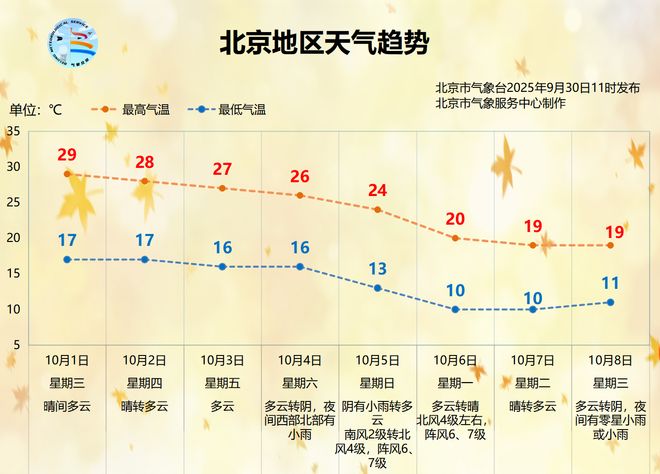 在西北气流的控制下,北京新闻(记者王·琼格(Wang Jingxi)),北京市有一个晴朗的晨空(9月30日),而天空在下午上升。大多数地区的天气适用于室外活动和窗户进行通风。太阳闪耀,温度迅速升高。预计一天中的最高温度将升至29℃,晚上的最低温度将约为16℃。今天下午,在山区的某些地方将有淋浴或雷暴。前往山区时,请注意防雨。北京的时间趋势。北京气象局提供的照片。北京气象天文台预测,从10月1日至3日,天气主要是阳光明媚的云彩,适合户外活动和旅行。白天,温度通常在27〜29℃时稳定,阳光充足,紫外线强。在第四次,W艾瑟逐渐变得多云,夜间从西部北部地区开始了雨季。在5岁影响的北京在阳光下下雨,温度也相应下降。旅行时要小心避免下雨。雨水在第五天晚上停了下来,北风慢慢起来。希望从第五晚到第六天晚上,北京的4级左风将朝北,阵风达到6或7级。在出来时,请小心避免空气。随着北风穿过边界,温度继续降低。预计最高日温度将从7日至8日降至20℃以下。气象部提醒您的天气将在假期期间发生巨大变化,因此请按时安排您的衣服,制定出色的旅行计划。我 - eDit bai shuang校对王XIN