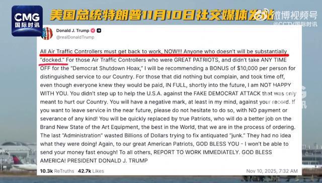 11月11日,据央视国际新闻报道,当地时间11月10日,特朗普总统在自己的社交平台上发文:“所有空中交通管制员必须立即返回,任何不返回的人都会有大幅‘减薪’。”对于在政府“关门”期间没有离开的空中交通管制员,特朗普提议给予每人1万美元的奖金。特朗普在其社交平台上发布了一张截图。由于空中交通管制员持续短缺,美国政府被迫连续多日削减航班。据路透社报道,美国政府“关门”期间,数万名空中交通管制员和运输安全管理局工作人员被迫上班没有工资,还有一些人因为打工赚取生活费等原因失业。美国联邦航空局上周宣布,“停摆”期间,美国30个最大机场的管制员每日缺勤率高达20%至40%。当地时间11月4日,美国交通部长、共和党人达菲表示,如果美国政府“继续”,美国交通管制人员短缺的问题将无法解决,可能会导致部分空域关闭。达菲还批评民主党为了获得政治吸引力而伤害美国人民。美国众议院民主党领袖杰弗里斯表示,达菲应该认真履行交通部长的职责,而不是像电视真人秀明星那样“表现”。杰弗里斯还表示,共和党是美国政府“关门”的根源。据消息人士透露,埃菲社11月4日报道称,像曼联这样的美国各机场空中交通管制一片混乱,4日下午5点左右,肯塔基州路易斯维尔国际机场,一架联合包裹服务公司(UPS)MD-11飞机起飞后不久在机场附近商业区坠毁。现场火光冲天,浓烟滚滚。当地官员称,事故造成至少 3 人死亡、11 人受伤。预计伤亡人数还会增加。不久之后,一架联合包裹飞机服务公司 (UPS) MD-11 货机停在机场附近的商业区。现场顿时火光冲天。达菲在社交平台X发文称,坠机现场的场景“令人心碎”。路易斯维尔市市长表示,涉事飞机上共有 28 万加仑(约 106 万升)燃油。根据FAA记录,涉事MD-11货机已有34年历史。该飞机项目的所有者波音公司拒绝对此事发表评论。据美国媒体9日报道,美国参议院达成协议,d 联邦政府“关闭”。当地时间11月9日晚,美国联邦政府“关门”40天之际,特朗普总统返回白宫后对媒体表示,“看起来我们即将开启‘关门’。”当地时间9月30日晚,美国参议院未能通过临时修复法案,联邦政府于当晚开始“关门”。这是联邦政府七年来的首次“关门”,也是特朗普任期内的第二次“关门”。据悉,美国参议院预计将在当晚对众议院通过的一项法案进行投票,但该法案被修改为将法案(可为联邦政府提供资金至2026年1月)与三项全年法案打包在一起。据报道,该法案得到了足够多的民主党参议员的支持,但据参议院少校称,该法案得以一票通过。共和党领袖约翰·图恩仍需众议院通过并送交特朗普签字,这一过程可能需要数天时间。迄今为止,参议院民主党人一直抵制通过一项旨在迫使共和党人同意改革医疗保健系统的法案,包括延长《平价医疗法案》下的补贴期限。根据目前正在讨论的协议,参议院将同意稍后就补贴问题进行单独投票。美国参议院领袖、共和党人约翰·图恩另外表示,截至美东时间9日16时,美国航班取消数量首次单日突破2000架次,创下政府航班削减措施开始以来的新高;与此同时,超过7000架次航班延误。由于空中交通管制安全问题,美国联邦航空管理局已命令航空公司从 2019 年 4 月开始将 40 个主要机场的航班减少 4%。罗7号。政府关门持续了40天,导致空中交通管制人员短缺。据悉,11月14日航班减少幅度将达到10%。来源:央视国际新闻、央视新闻、桑谷年巴利塔等。