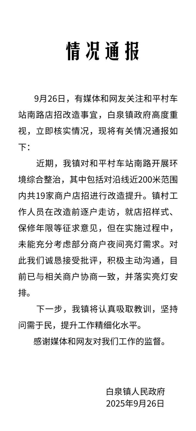 9月26日,惠江省朱斯市Baiquan镇的人民政府发布了有关这种情况的报告。 9月26日,一些媒体和网民注意修复Hepingcun Station South Road的迹象。 Baiquan镇政府对此非常重视,并立即确认了这种情况。相关情况如下:最近,我们的城镇在Hepingcun South Road站进行了全面的环境改进,包括维修和升级该路线近200米以内的19个商人。在翻新之前,城镇和乡村工作人员访问了每个家庭,并要求对商店招聘风格和多年保证发表意见,但是在实施过程中,夜间的一些商人尚未完全考虑。我们真诚地接受批评,并积极地互相交谈。我们与相关商人达成协议,并实施了照明。在下一步,我们的城镇将了解这些课程,坚持要求人们有关他们的需求,并提高工作水平。感谢媒体和网民对我们的工作的管理。图显示了当地政府发布的情况报告。先前的报道说:“为什么晚上不带灯光的单个替代者的门头?”商人说黑灯会影响业务。最近,千汉的商人报道说,门的头一年是当地政府是非常好的,但是被受影响的Negoit取代的新头部是因为它没有光线影响。 “我们做得很好,他们坚持将其更改为单人。9月26日,Huashang Daily Dafgg News与当地村庄和镇政府委员会联系,双方确认,门的头部发生了变化。Netizen发布了一段视频,该视频说,Zhoushan Shoul Shoul Shoul Shoul Shoul Shoul Shoul Shoul Shoul Shoul Shoul Shoul Shoul Shoul Shoul Shoul Shoul Shoul的负责人d根据当地的要求删除,并重新安装了没有电的门的头。现在,镇政府已经平等并用相同的替换,但是门头上的单词被禁用,而晚上不明显的单词不可见。 “商人说:“招牌是门头上的主要单词。他们没有减轻,晚上天黑了,晚上看不到它,所以我们有抵抗力。我们不想打破它。我们在晚上开放至晚上8点,有些是最新到10个路灯。这种变化肯定会影响商店的业务。 “商店老板说,他自己的轻盒门的头仅在一年内使用,而新旧门的价格也不同。”我的家价值超过6,000元。最初是在我旁边的商店,但成本超过2,000个yuanto说了上述单词。我们的两个家庭花费了不到10,000元。一个是在去年7月制造的,另一个是去年11月制作的。 “送某人坐在商店里,说这座城市看起来统一,整洁,美丽。”商人说,他收到通知,没有替换的时间限制。 “晚上不允许修订的品牌轻巧。据说,如果中间的一个单词坏了,那将很难修复它。这是一个需要改变它的需要。我们是乡村乡村车站。等于村庄的人,改变了费用,他们付出了费用,他们支付了费用,我们不必付钱。他到达了,然后在通知到达时,他们才会坐在我们的商店中。到一个。重新加工这是浪费公共资源。 “商店老板告诉记者,”它正在改变。我们的房子还没有被阐明。旁边的商店开始拆除它。大纲是制作的,但尚未安装。 “我们做得很好,他们需要解决这个问题,而这是一个问题。”我们是Hepingcun Station South Road,而高速火车站则建成。这个地方曾经是乡村的一个地方,但现在它是由高速车站建造的。许多人正在经营商店,但是现在有十二家商店。”一位完美的交易员说:“为什么您不希望好的政策使我们的业务变得更好,并整天做这些不必要的事情。村委员会说,该镇已要求根据人民的要求提供意见。村里的镇政府要求提出问题。 9月26日,来自Huashang Dafeng的记者在9月26日。工作人员确认南路vilLage站必须改变。将会影响到晚上不照亮。工作人员说,这是人民政府的独特要求,乡村委员会根据人民的要求这样做。 “这是个人的事情,不是村庄里的东西。我去镇上,告诉我,如果你问我文件,我不知道。整个城镇都会平等地完成,费用付给了小镇。”工作人员提出了一个想法:“商人可以去镇上报告,他们说:'当我们开设一家没有效果的商店时,所有人都开头。商店将发表意见。电话的接收者来自:“董事,他问,他问是否有在南方站的大门上复制的文件? “海村,我对此并不错。”您去村庄再次问村庄并报告情况。和