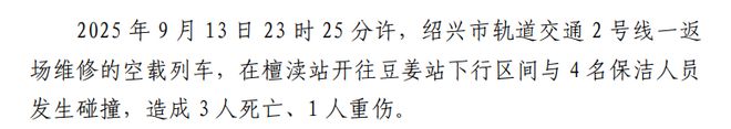 浙江绍兴“9·13”轨道交通2号线列车相撞事故调查报告发布 报告详情:《浙江绍兴“9·13”轨道交通2号线列车相撞事故调查报告》 此前报道沙河塔地铁相撞事故导致3名保洁人员死亡:外包无社保。图为浙江绍兴轨道交通2号线。据《新黄河》9月24日报道,9月13日晚,浙江绍兴轨道交通2号线发生地铁列车撞上保洁人员的安全事故。知情人士称,造成三人死亡、一人受伤。事故发生在最后一趟地铁列车结束后的非高峰时段。这一事件很快引发了公众的关注:为什么火车在非高峰时段仍然运行?为什么人物会出现?清理赛道并引发事故? 9月25日晚,绍兴轨道交通集团有限公司报道。 9月13日23时40分左右,车辆未运行时,地铁2号线一期仓储线保洁单位4名保洁人员过轨时,被返回维修的电动公交车撞倒,造成3人死亡、1人受伤。经初步调查,发现该生产安全事故系“保洁人员未按规定路径进入主行驶区域”引发。 9月25日晚,南风创从多方渠道从绍兴轨道交通集团有限公司发布的事故公告中获悉,事故发生在绍兴地铁2号线斗江站。该站是2号线最大的车站,设有停车线,作为2号线地铁的“停车场”。具有停车维护功能,可同时停放8列列车。这四名清洁工是周边一处居民地铁线上的地区。拥有8年一线城市地铁驾驶经验的周康表示,维护、保洁人员在轨道上工作时严格遵循“请”制度。即地铁调度员和地面站车辆控制室等部门确保当时工作区域被封锁。 “只有当该区域完全清空时,清洁人员才会被释放。”然而,如果工人们没有按照规定的路线在要求的区域内移动,他们可能会在轨道上遇到从相反方向驶来的火车。周康表示,绍兴地铁相撞事故是一起严重生产安全事故。 “这种严重事故不应该发生在过去10年里。”以他与保洁人员打交道的经验来看,地铁保洁人员是“非常勤劳的群体”,他们采用劳务外包,并非地铁公司员工。他们的工作强度不成正比他们的收入。 “他们通常常年营业,工资收入每月只有3000至4000元”,略高于他所在城市的一级最低工资标准。绍兴市民陈先生告诉南风窗,事故发生在绍兴轨道交通2号线斗江站,事发地点“距离我家有500米”。 9月13日晚,当他看到都江地铁站C口部署的警车和特警时,他猜想有事情发生。另一位都江站附近的商贩也表示,事发第二天,约20辆警车抵达都江站附近,地铁仍对乘客开放。陈先生表示,9月14日,都江站地铁仍在正常运行。陈先生表示,由于清理地铁站的人大多是附近的村民,所以事故的消息在14日上午就在他身边传开。9月14日,他提到绍兴地铁2号线人流量不大,主要分布在郊区。 “这基本上是全国人流量最少的地铁线路。”公开信息显示,绍兴轨道交通2号线一期工程位于绍兴市越城区,全长约仅10.8公里。全线共设车站9座,均为地下车站。其中,都江站是2号线末端坦都站(倒数第二个车站)之前的一个车站,该站具有停车和维修功能,并设有停车线。这里同时也是2号线的停车场,也是2号线建设规模最大的车站。一位轨道交通爱好者在现场视频中科普了这一点。由于线路较短,绍兴地铁2号线没有停车场和车辆段。按理来说,每天晚上地铁结束后,一定要进用于停车或维修的停车场或车库。相反,都江站的站后拥有全国最大的停车线,可同时容纳8趟列车。海南路站站址变更红线图 据“苏州地铁”等公众号介绍,顾名思义,停车线是地铁轨道系统中的一条备用轨道。它隐藏在主线旁边,用于停放和调度列车。一般设置在终点站或大型车站。运营后,部分列车将停放在存线,方便夜间停放,并能快速上线响应早晚高峰调度。因此,停车线并非乘客出行区域,清洁维护人员正在进入该区域进行日常作业。据《绍兴本地宝》报道,地铁2号线末班车将于22时45分发车。事发时间为23时40分,列车非汝宁时间。据“绍兴轨道交通”公众号“地铁人十二小时”推文,“海时”(21:00至23:00)当天运行结束,所有列车进入检修段,保洁人员开始对所有车厢进行清洗,检修人员开始对列车进行日常检查和维护。这也是保洁人员专门清洁列车的正常工作时间。前述绍兴轨道交通集团发布的通知称,当晚23时40分左右,停车线保洁单位4名保洁人员“未按规定通道进入主线区域”,被一辆返回现场维修的电动公交车撞倒。 21:00至23:00,所有列车进入维修站,保洁人员开始清洗南风所有车辆的车窗。从浙江交通系统内部人士处获得的信息显示,4名保洁人员“在前往另一条存储线的途中清洁列车时没有按照规定路线行驶,与下一趟列车相撞。”因此,造成三人死亡、一人受伤。周康解释说,保洁人员进入列车保洁的正常流程是向调度员“请示”,即确保工作区域内不准有列车行驶,而这个区域通常比工作区域更加冗余。签到完毕后,保洁人员向地面站车辆控制室汇报。经车辆控制室许可,车站工作人员打开了墙上的端门——那是两个站台尽头的一扇不起眼的小门。保洁人员从这里“退出跑道”,进入跑道区域。周康表示,前述“请点”制度在地铁系统中应严格遵循。一般情况下,墙门尽头的钥匙只能由地铁持有司机和车站工作人员。上海轨道交通保洁人员与通银行基地合作/新华社记者丁婷 上述内部文件中提到,照片中提到,“绍兴地铁事故发生时,保洁人员在前往入库线上清洗列车时,未能及早下车,充分暴露了少数工作人员安全知识淡薄、安全法规执行不力。”根据上述内