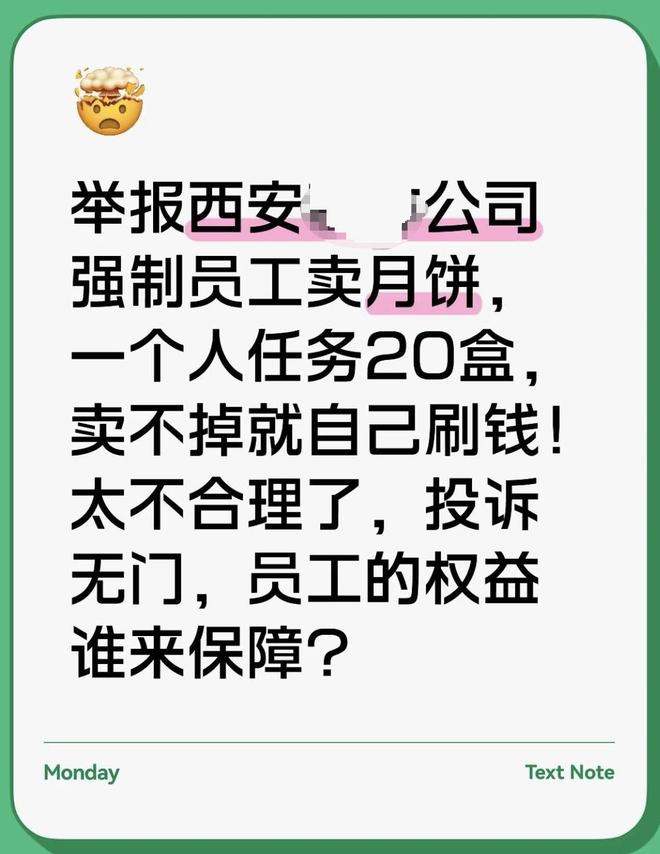 JIMU新闻记者张浩(Zhang Hao)于9月8日发表了一篇文章,报道说,西安(Xi'an)的购物中心强迫员工出售月饼。一个人有20箱任务。如果他不能出售,他会自己付钱。博主认为这是不合理的。博客作者发布了一篇文章,报道说,西安的购物中心强迫员工出售月饼,有人做了20箱的工作。资料来源:被告的社会帐户在10日,Jimu News的记者与上述博客作者联系,声称他是购物中心供应商的员工,通常在购物中心工作。分布在购物中心的月饼有不同的价格,例如88元,138元,188元和268元。这些月饼不在网上出售,必须在离线上出售。不是Mahalaga的价格是多少,有一个20箱的任务,因此您需要直接购买它们。 10日上午,负责上述购物中心的相关人员对Jimu新闻记者的回应是,员工有一些销售目标,这是正常的,但该公司没有迫使员工购买月饼。上述在线帖子的内容是不正确的,可以在平台上报告。网络屏幕截图对购物中心的评论。上面的博客作者说,他说的是真的。在据报道8次购物中心后,购物中心在9点下午举行了一次会议,改变了言语,并表示不要求使用20箱。博客作者希望该公司能够保持诺言,并且不会迫使员工将来出售月饼。 JIMU新闻记者指出,中期音乐节正在临近,评论区的Maraminthe网民对强迫销售Mooncakes表示厌恶,而中后节成为“中期节日灾难”。一家五星级酒店的一名工作人员还向记者抱怨说,他被分配了出售500箱的任务。 “我不会卖掉它,吃蛋糕的日子!” StafF五星级酒店的成员还向记者抱怨说,他已被指定为出售500箱的任务。资料来源:聊天屏幕截图合理地向购物中心分发20盒月饼?西安市政人力资源和社会保障局的工作人员说,如果供应商与公司之间存在冲突,双方都可以组织。如果单位与雇员之间有一致的工作内容,并且双方都同意,那就没问题。如果修改和修改了工作内容,双方尚未达成协议,并且存在争议,并且出现了争议,则可以向该地区的制造部仲裁报告投诉。西安劳工和法院仲裁人员的工作人员说,如果相关当事方没有提出投诉并提起诉讼,他们可以联系12348,以咨询公共福利律师。 Henan Zejin律师事务所董事Fu Jian认为该公司无权任命月饼销售任务,并要求员工自己的口袋里付款。雇主不应以任何形式降低或支付工资。该公司单方面分配销售任务,并要求员工带来Kabe奠定的后果以完成任务。这是伪装的工资或强制交易的伪装,违反了劳动法的相关规定。工人也许可以向劳工管理部门报告并要求公司进行更正。根据“劳工和社会保障监督法规”,公司拒绝纠正其行为也可以在2,000元到20,000元之间被罚款。 (来源:JIMU新闻)